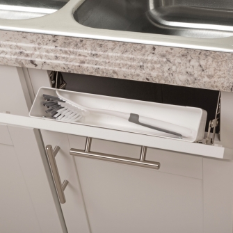 Turn unused sink-front space into storage with our sink front tray cabinet organizer kit. Self-closing hinges tip out for easy access. Keeps brushes, soaps, sponges and more close at hand.